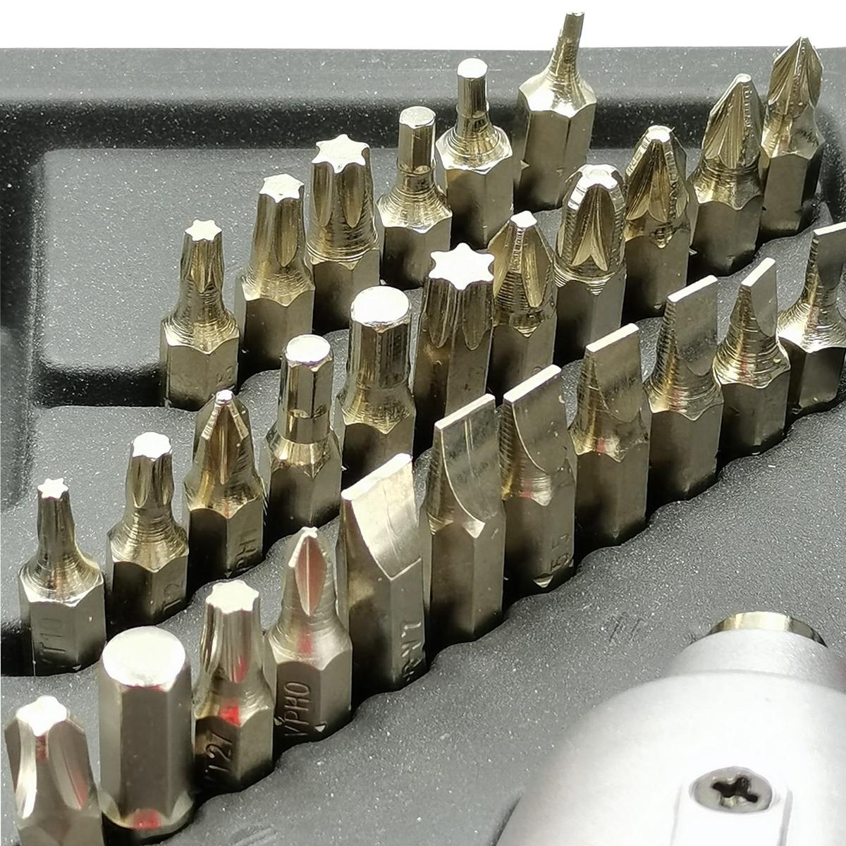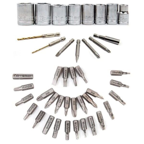 تتكون مجموعة الأدوات من 34 قطعة بأحجام مختلفة، ومحولين و8 مقابس. هيكل من مادة متينة لللقم والمقابس يقاوم التآكل ويمنع الانزلاق.